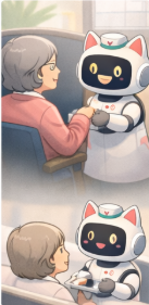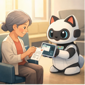 患者さんが来局したら、まず出迎えるのは、白衣の薬剤師ではなく、AI猫型ロボット。