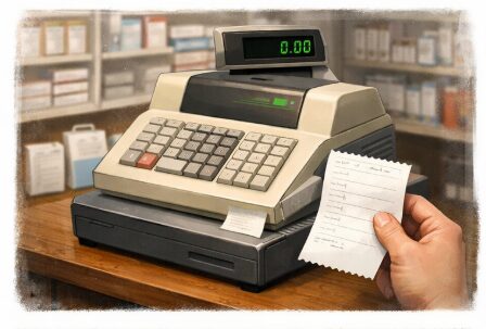 いまでも小規模の薬局ではこのタイプのレジが現役だ。